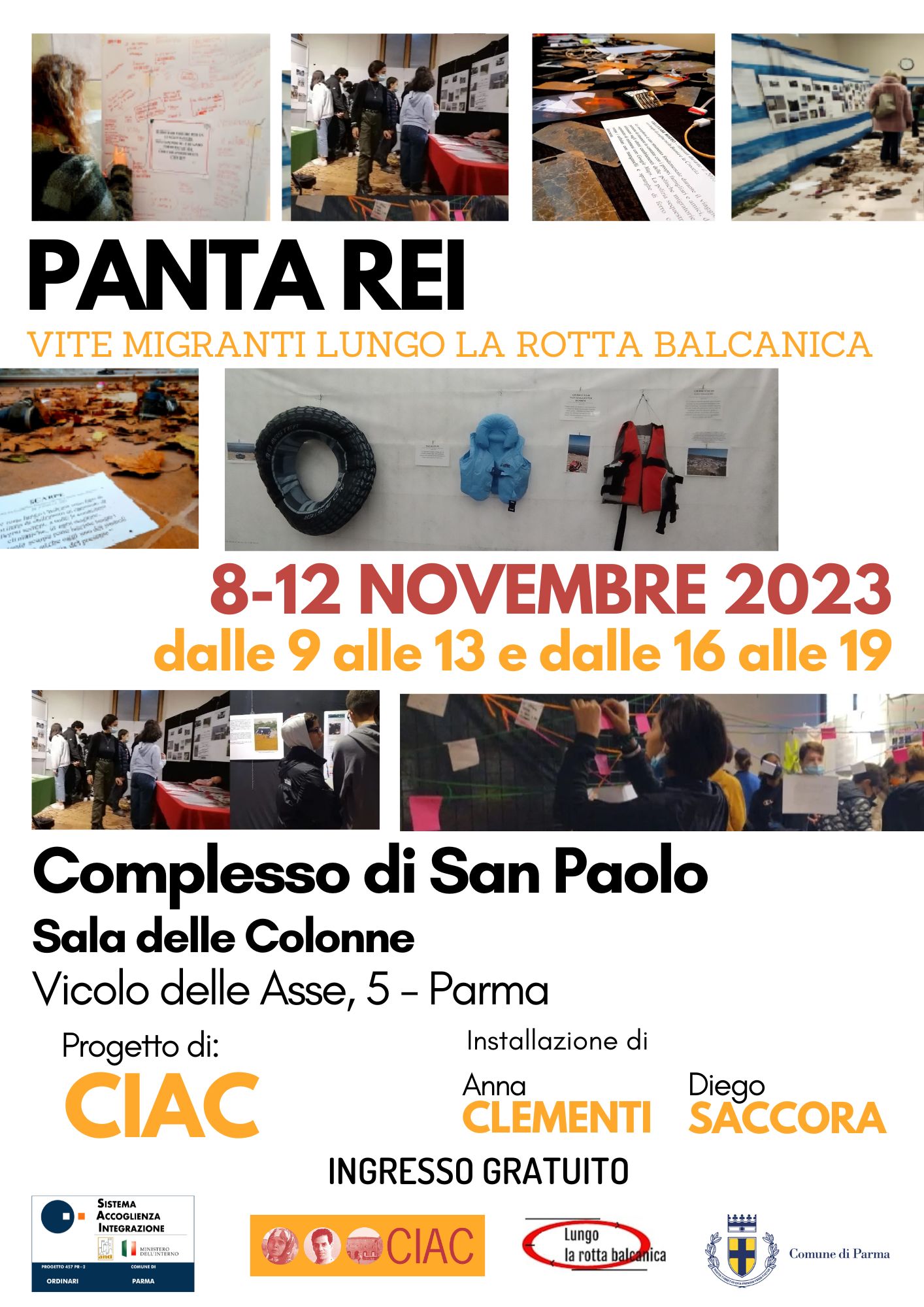 Il percorso, curato da Anna Clementi e Diego Saccora, sarà inaugurato mercoledì 8 novembre alle ore 17.30 nella Sala delle Colonne nel Complesso di San Paolo (vicolo delle Asse 5) a Parma, in presenza dei curatori, dell’assessora Daria Jacopozzi che ha patrocinato l’evento e di Chiara Marchetti dell’associazione CIAC, promotrice dell’iniziativa dell’ambito del progetto del Sistema di Accoglienza e Integrazione “Una città per l’asilo”. La mostra sarà visitabile dall’8 novembre e fino a domenica 12, con orari 9-13 e 16-19, è anche possibile prenotare negli stessi orari una visita dell’installazione guidata dai curatori e rivolta a classi scolastiche e gruppi, scrivendo a associazione@ciaconlus.org.
